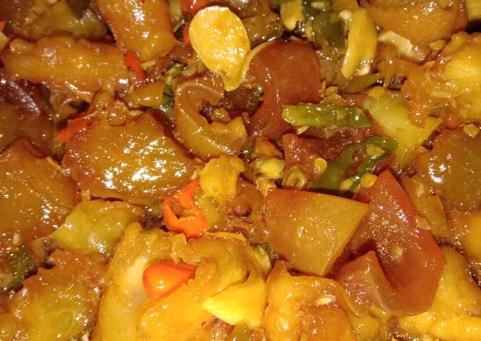 - Masukkan tunjang. Aduk2 sebentar. Tambahkan air sedikit. Masukkan gula jawa, garam, sedikit gula pasir (sebagai penguat rasa pengganti msg) dan tambahan sedikit saori saos tiram..