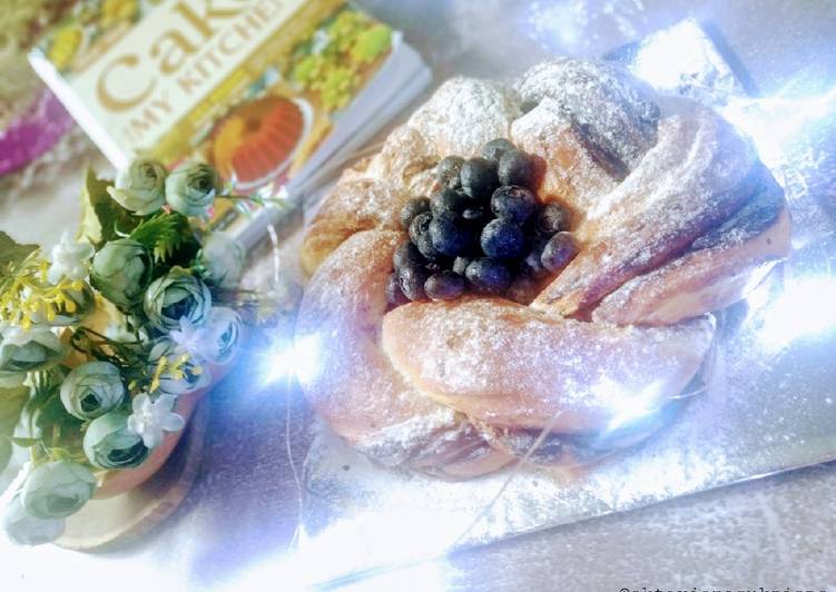 - Panaskan oven dengan suhu 180°C api atas bawah. Lilit kepang, lalu bulatkan, diamkan sampai mengembang 2 kali lipat. Sesaat mau dioven, oles dengan susu cair di seluruh permukaannya..