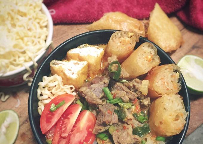 - Dalam mangkok, letakkan bihun, mie kuning, irisan tomat, daging dan siram dg kuah. tambahkan risol dan pelengkap lainnya. hmm siap dinikmati hangat2..